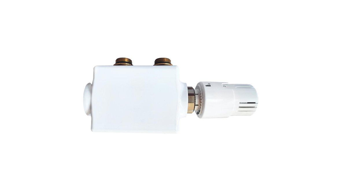 H-ventil set s glavom i poklopcem dvocijevni Terma, kutni, termostatski, bijeli, s reduciranim nazuvicama, za vertikalne radijatore