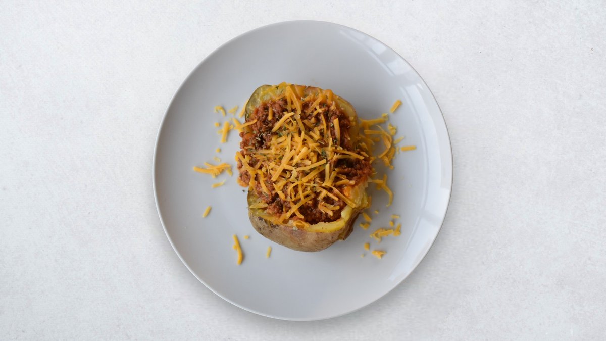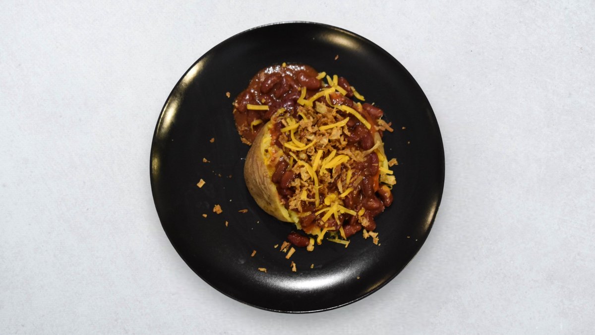 Pečeni krumpir, ribani sir, maslac sa češnjakom, chilli con carne, prženi luk