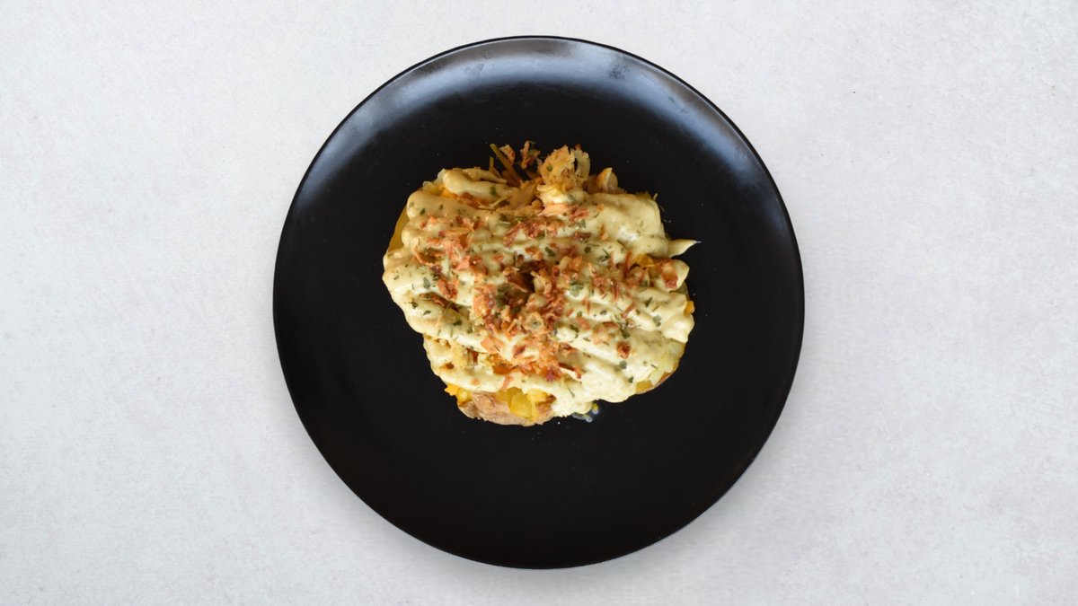 Pečeni krumpir, ribani sir, maslac sa češnjakom, piletina, tram umak, prženi luk