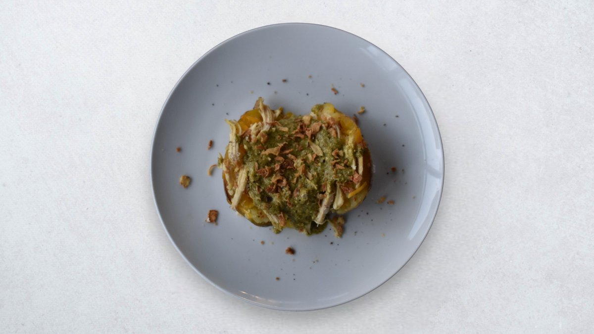 Pečeni krumpir, ribani sir, pesto Genovese umak, piletina, prženi luk