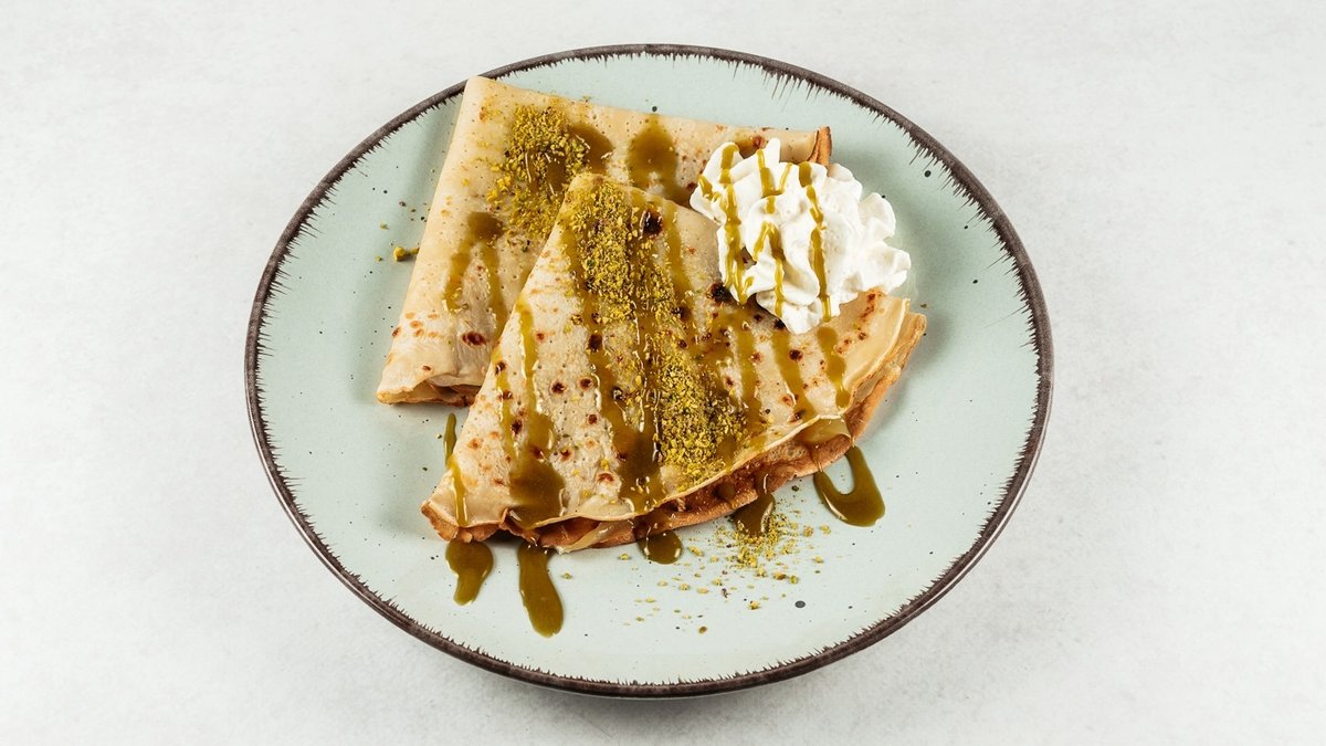2 palačinke, kadaif, punjenje od pistacije, Nutella, mljevene pistacije, preljev od pistacije *slika je simbolična