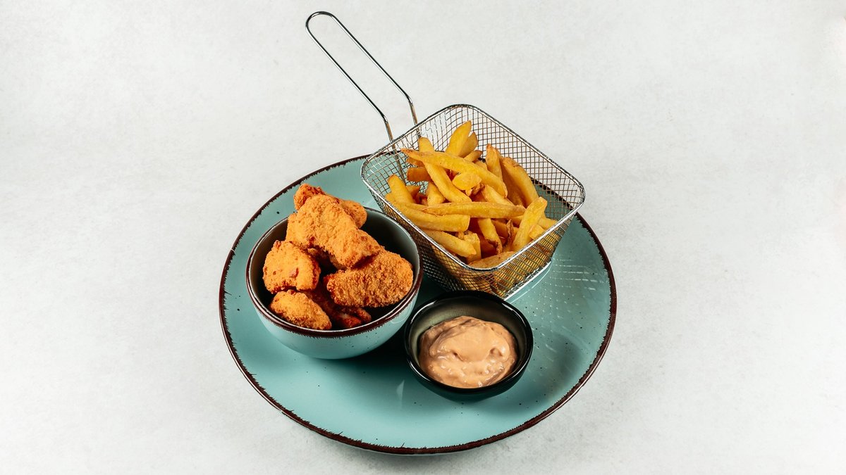 5x pileća krilca po izboru (pikant/ BBQ), 5x nuggetsi , pomfrit *slika je simbolična