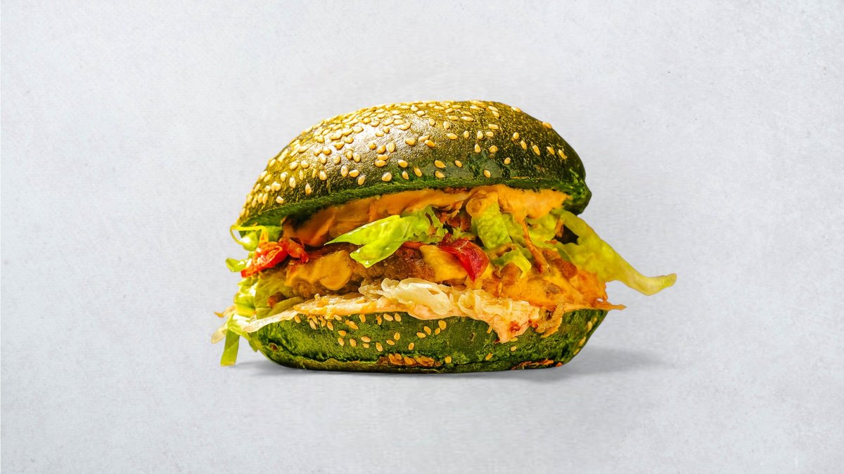 Zeleno brioche pecivo, pljeskavica, burger umak, kiseli kupus, zelena salata, slanina, prženi luk