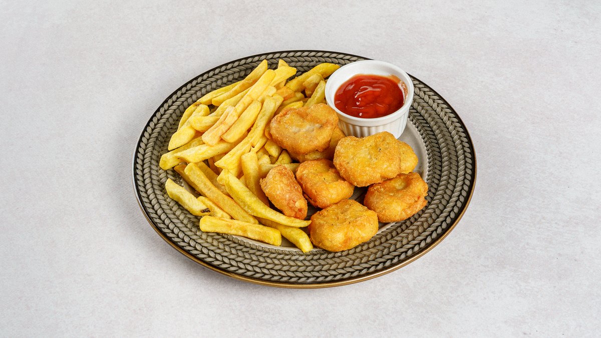 Pileći nuggetsi, pommes frites, ketchup