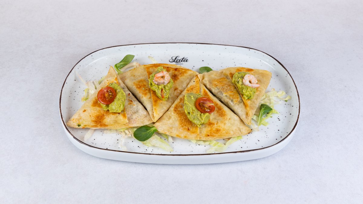 Tortilja, kozice, paprika, tikvica, šampinjoni, mozzarella sir, guacamole, lisnate hrskave salate