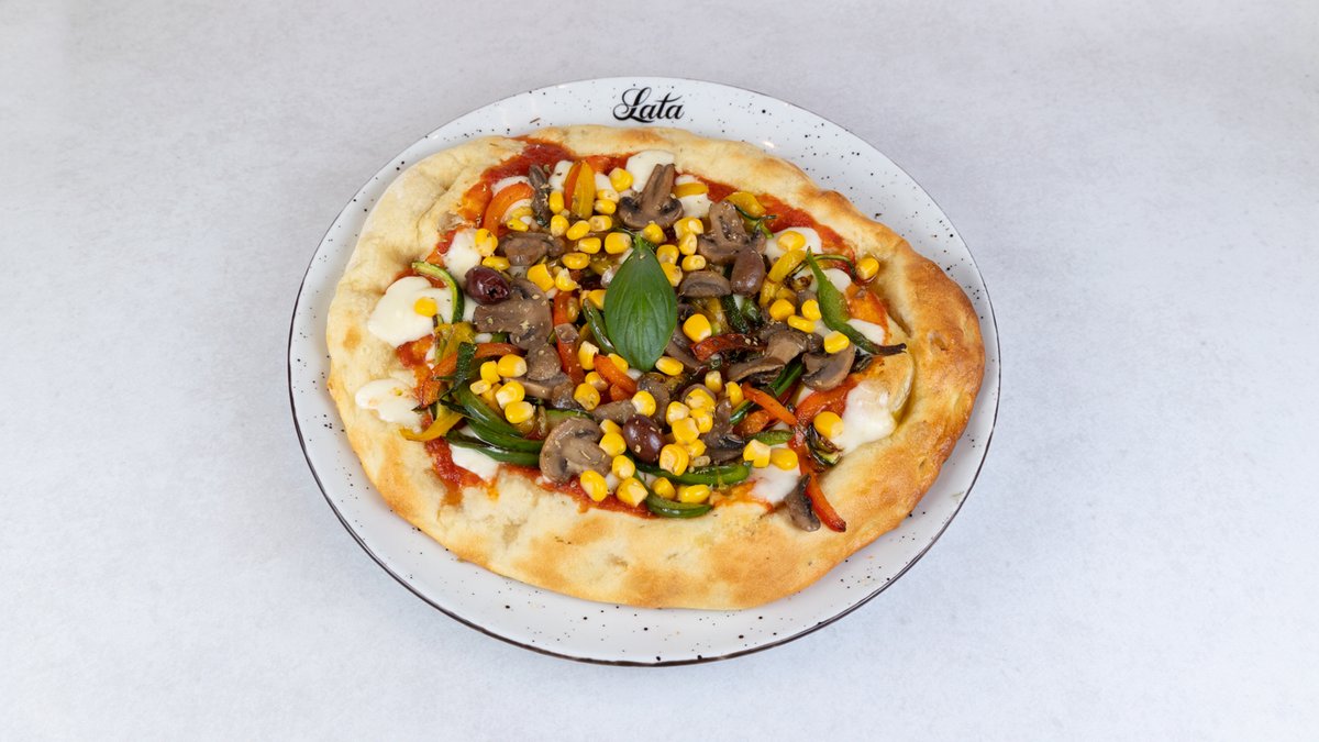 Umak rajčica, mozzarella fior di latte, šampinjoni, paprika, tikvice, kukuruz, papričice, kalamata masline, origano, svježi bosiljak