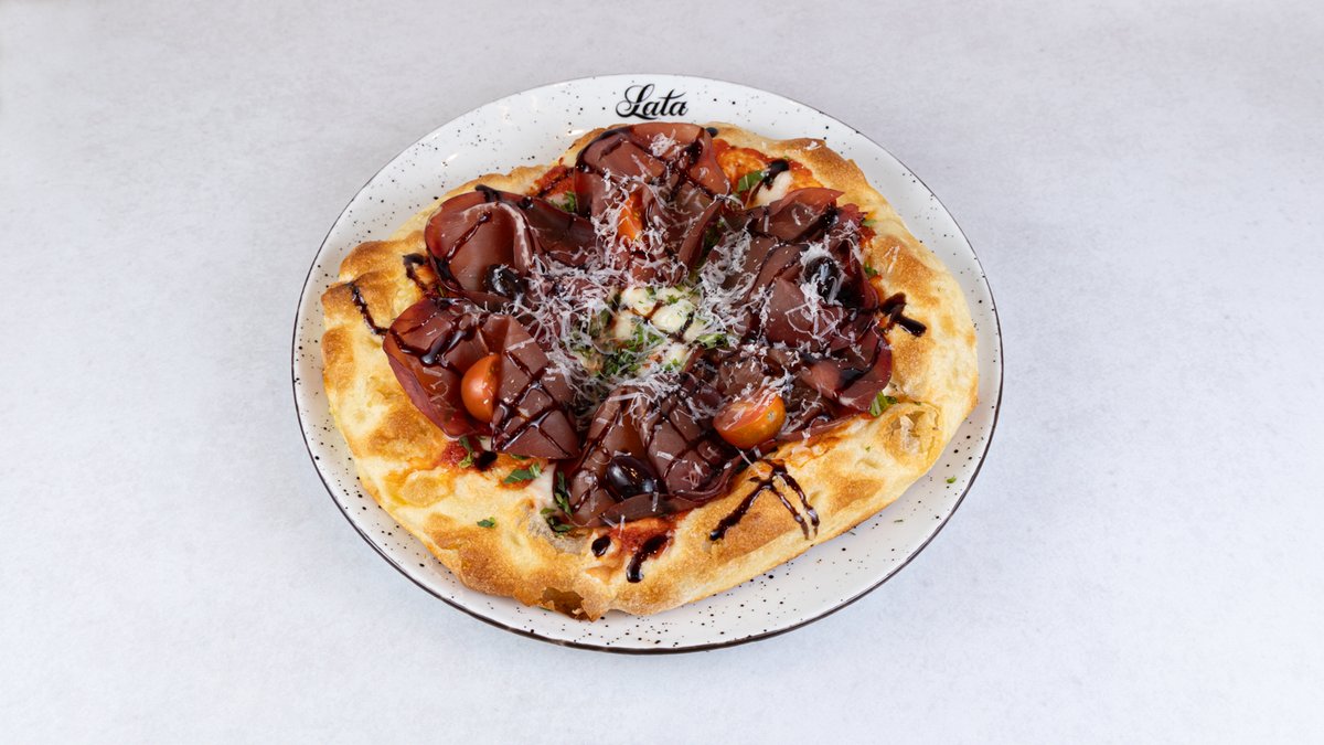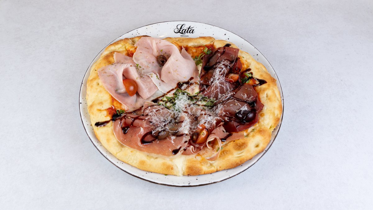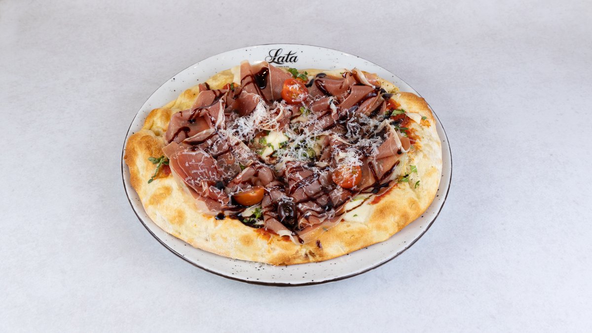 Umak rajčica, mozzarella fior di latte, grana padano, šunka, pršut, bresaola, reducirani aceto balsamico, cherry rajčica, rikula, kalamata masline, origano, svježi bosiljak
