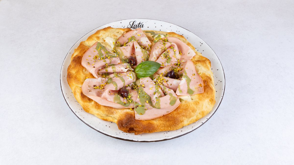 Krema pistacija, drobljene pistacije, mozzarella fior di latte, mortadela, kalamata masline, origano, svježi bosiljak