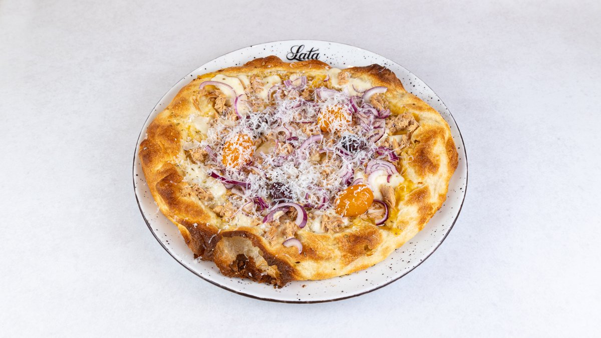 Umak rajčica, mozzarella fior di latte, grana padano, tuna, crveni luk, žuta rajčica, kalamata masline, origano, svježi bosiljak