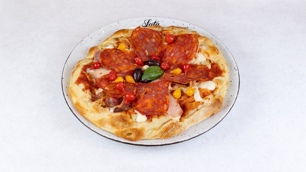 Umak rajčica, mozzarella fior di latte, šunka, kulenova seka, guanciale, papričice, kalamata masline, origano, svježi bosiljak