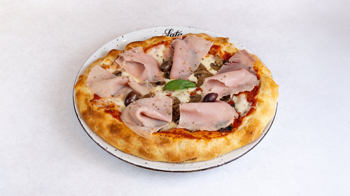 Umak rajčica, mozzarella fior di latte, šunka, šampinjoni, kalamata masline, origano, svježi bosiljak