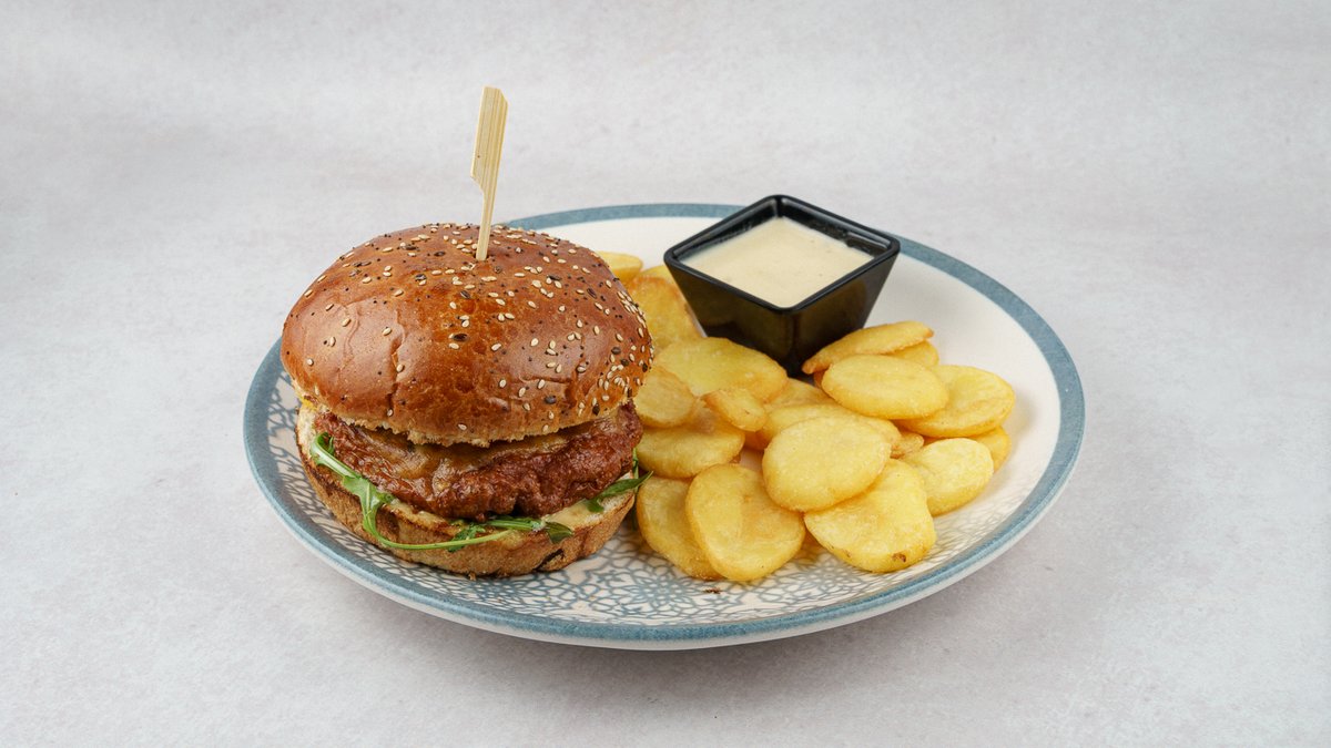 100% burger od junećeg mesa sa svježom salatom, krastavcima, rajčicom, special umakom šefa kuhinje, pekarskim krumpirom i pohanim lukom