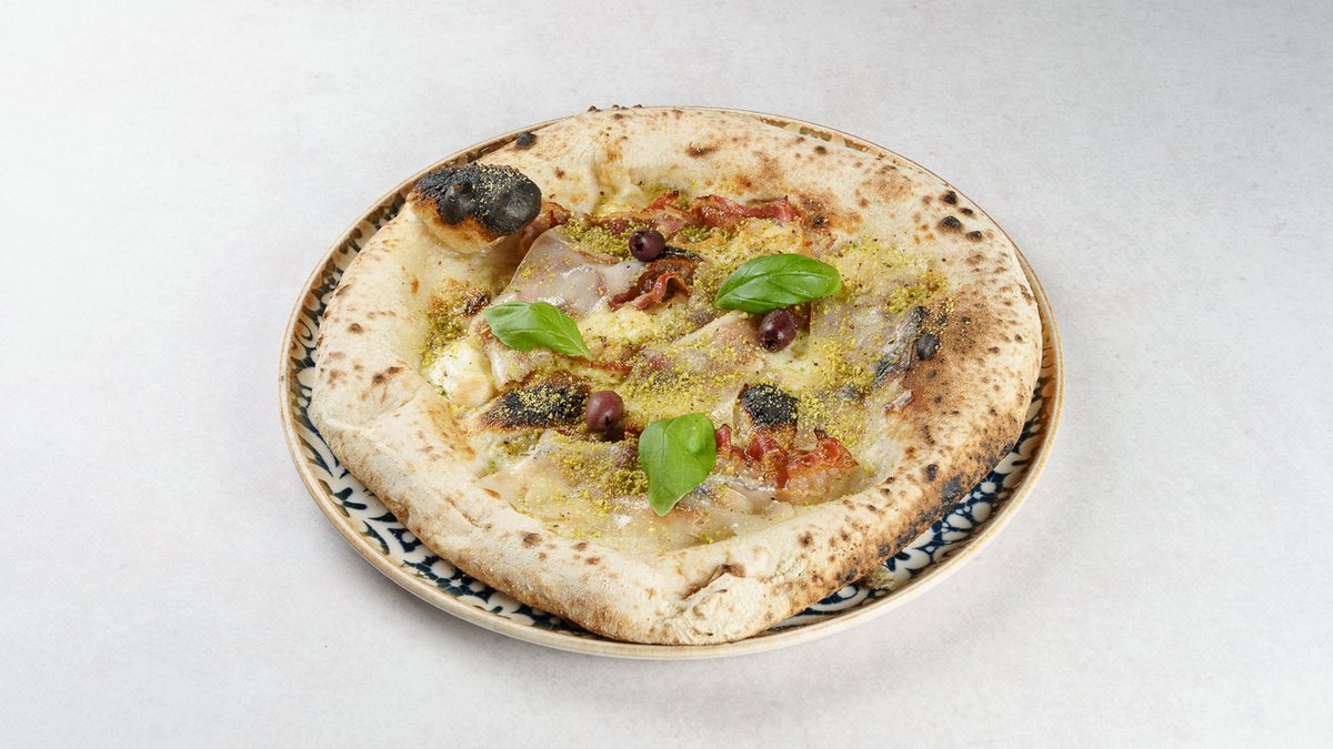 Dimljena buffala mozzarella, panceta crne slavonske svinje, lardo, pistacio, bosiljak, kalamata masline