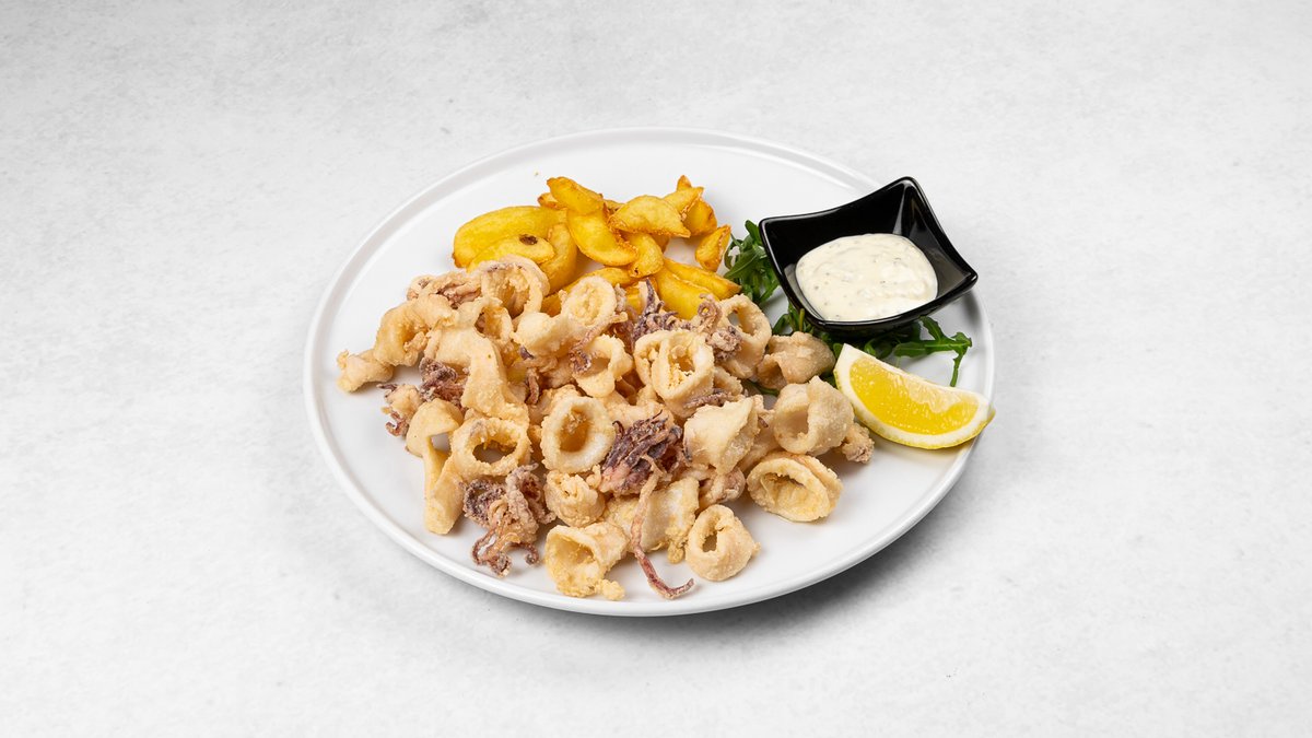 Prženi kolutići lignje, tartar, limun, pomfrit ili lađice *slika je simbolična