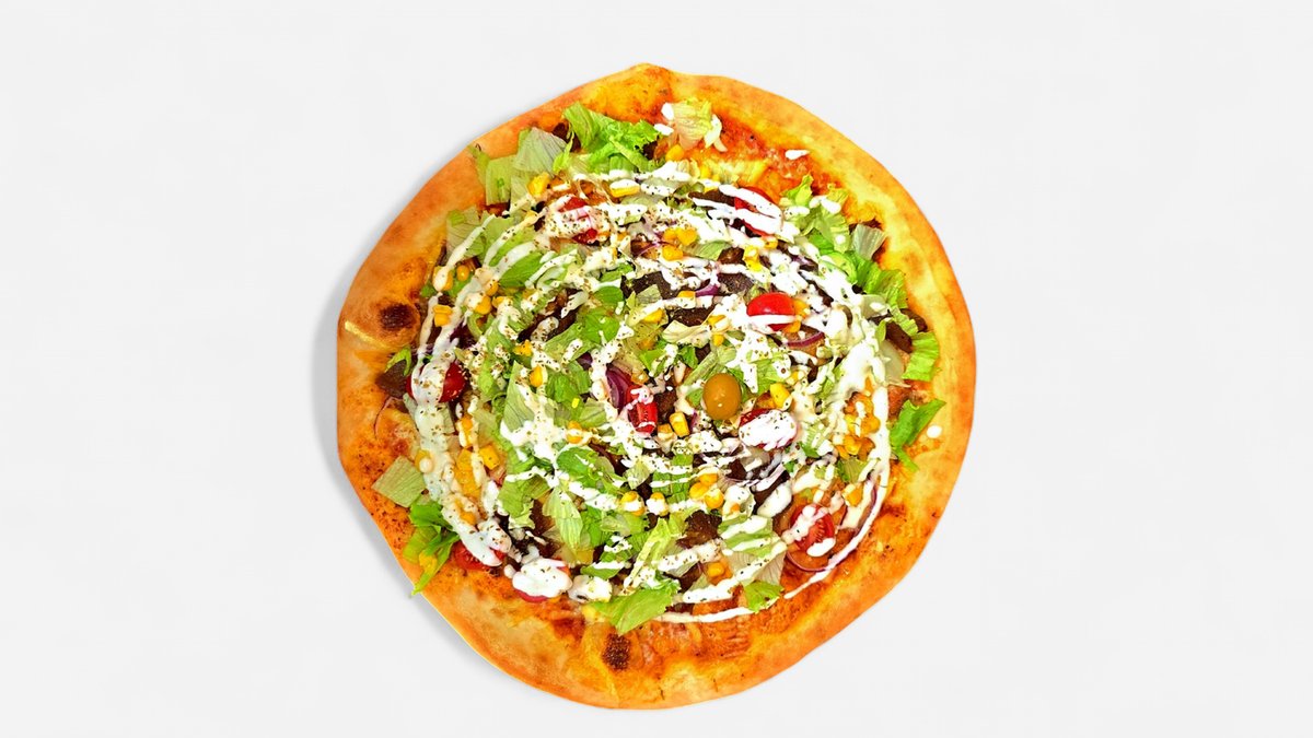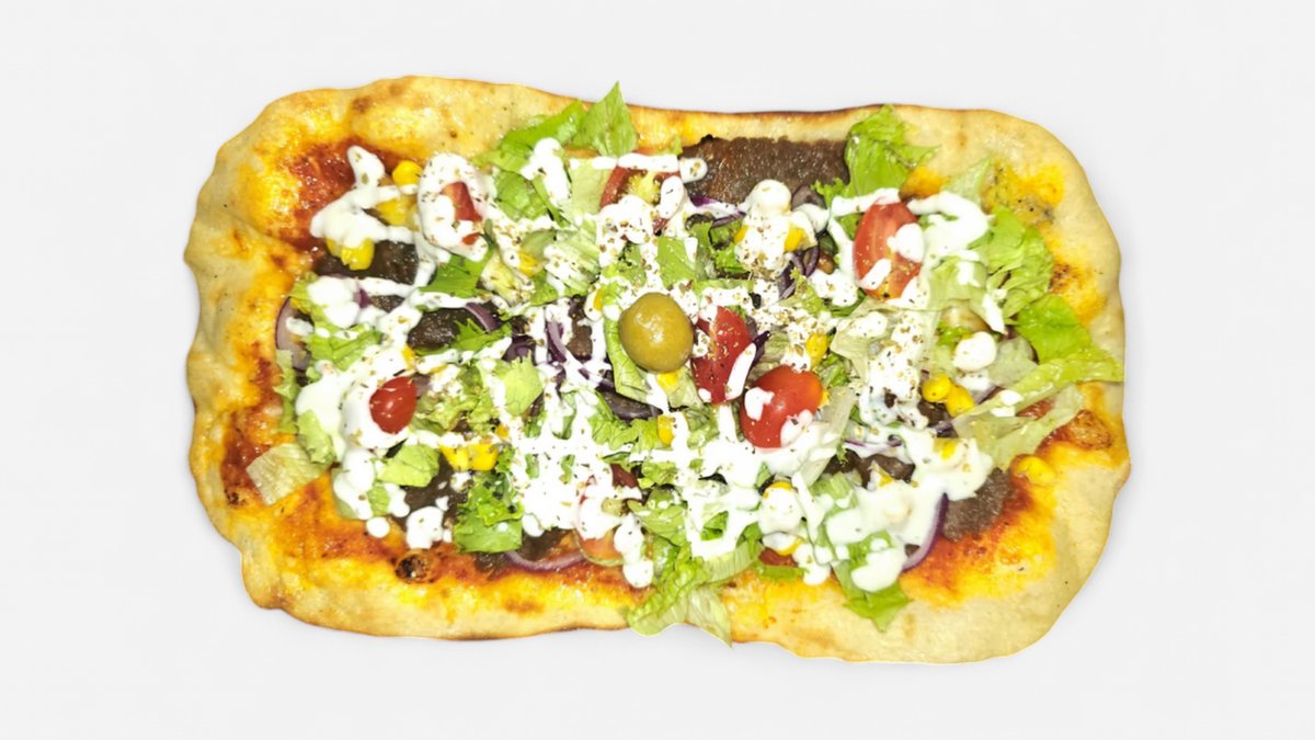 Džepna pizza 25x12 cm Umak od rajčice, sir, goveđe kebab meso, luk, kukuruz, zelena salata, cherry, kebab umak