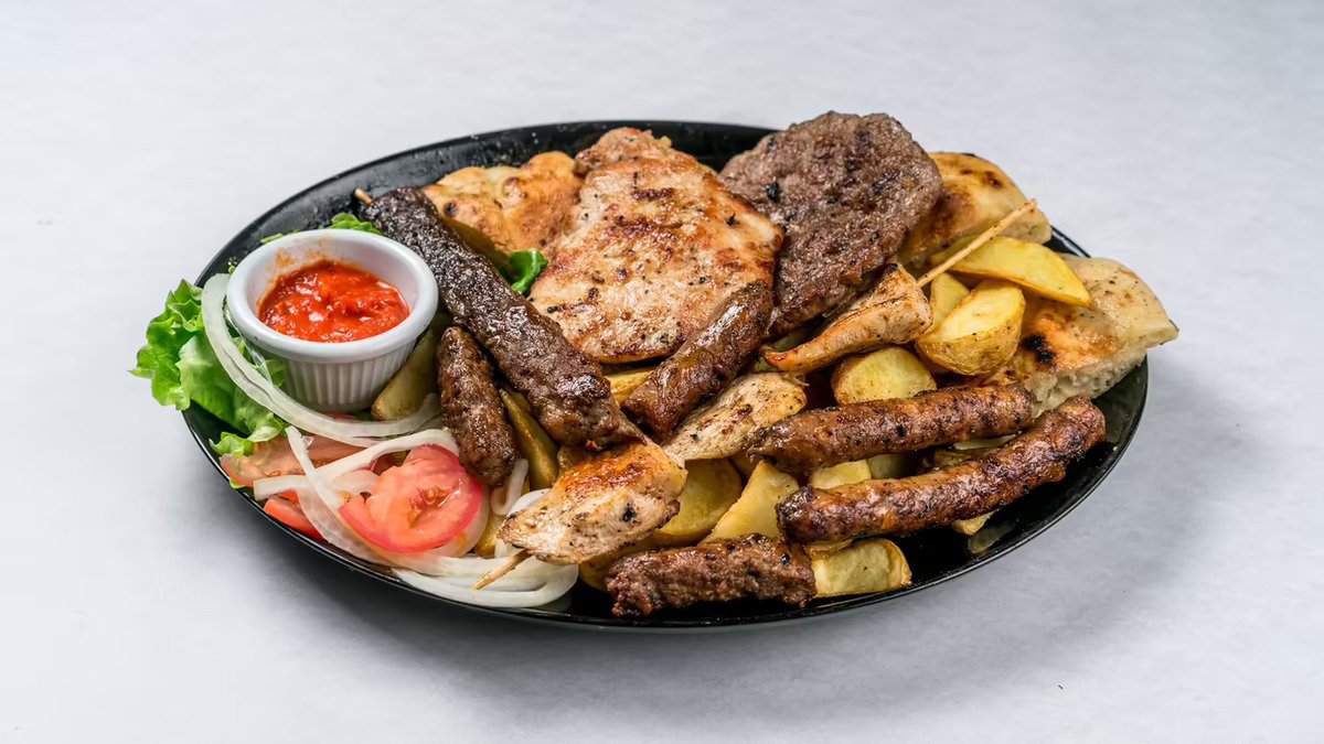 4x ćevapi, 2x pileća prsa grill, 2x pileći ražnjići, 2x vratina, 2x punjena pljeskavica, ajvar, luk, lepinja, pomfrit ili lađice