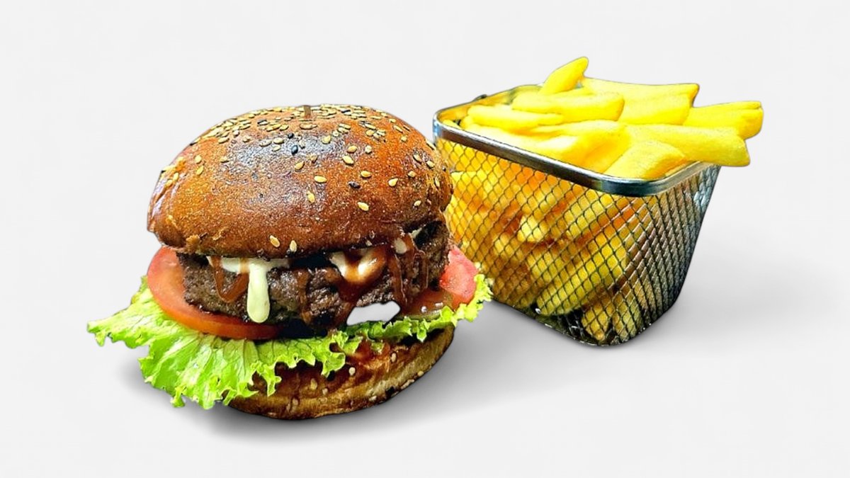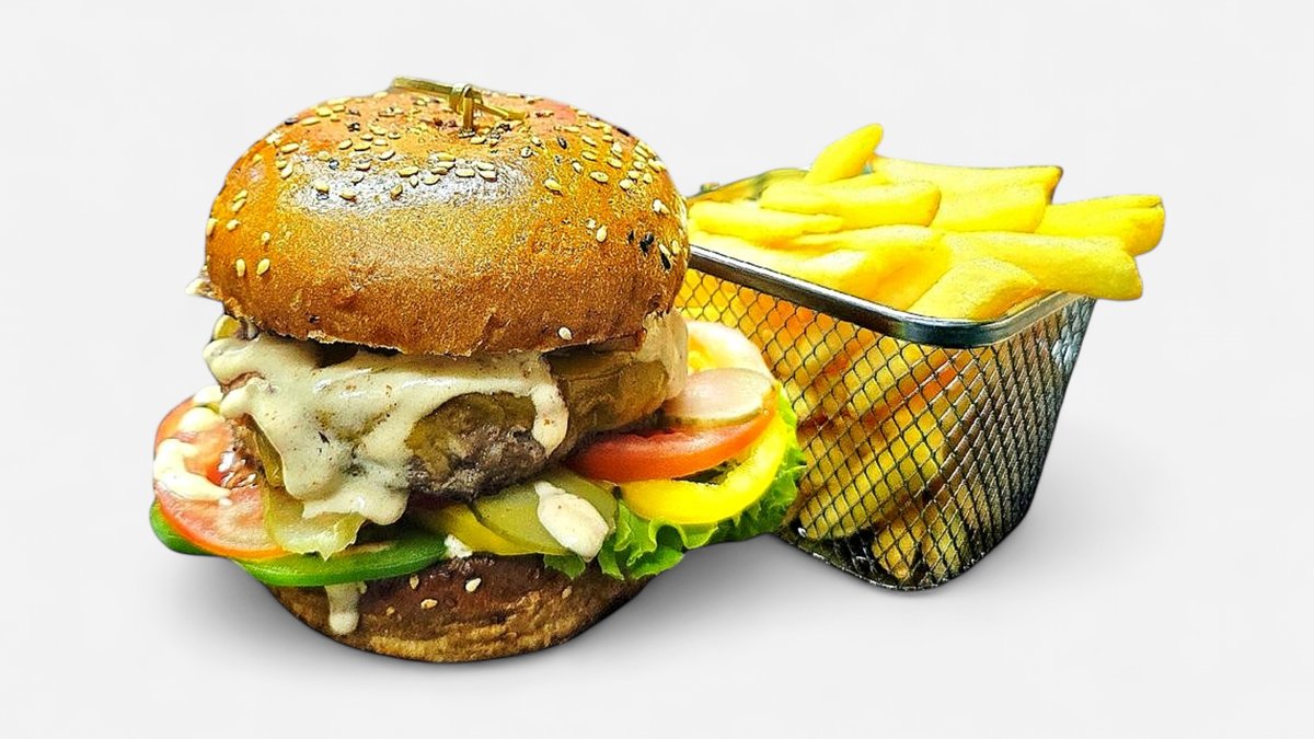 Pljeskavica, zelena salata, rajčica, sir, umak po izboru u burger, pomfrit ili lađice *slika je simbolična