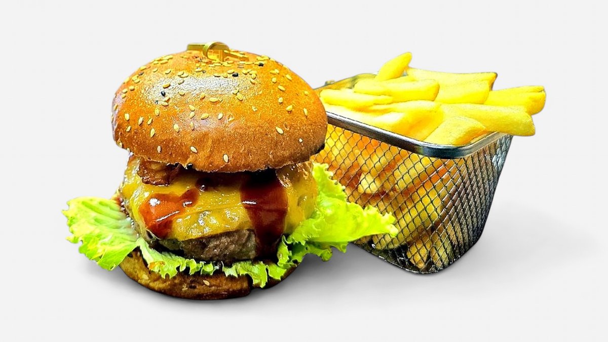 Pljeskavica, cheddar, karamelizirani luk, rajčica, zelena salata, slanina, pomfrit ili lađice *slika je simbolična
