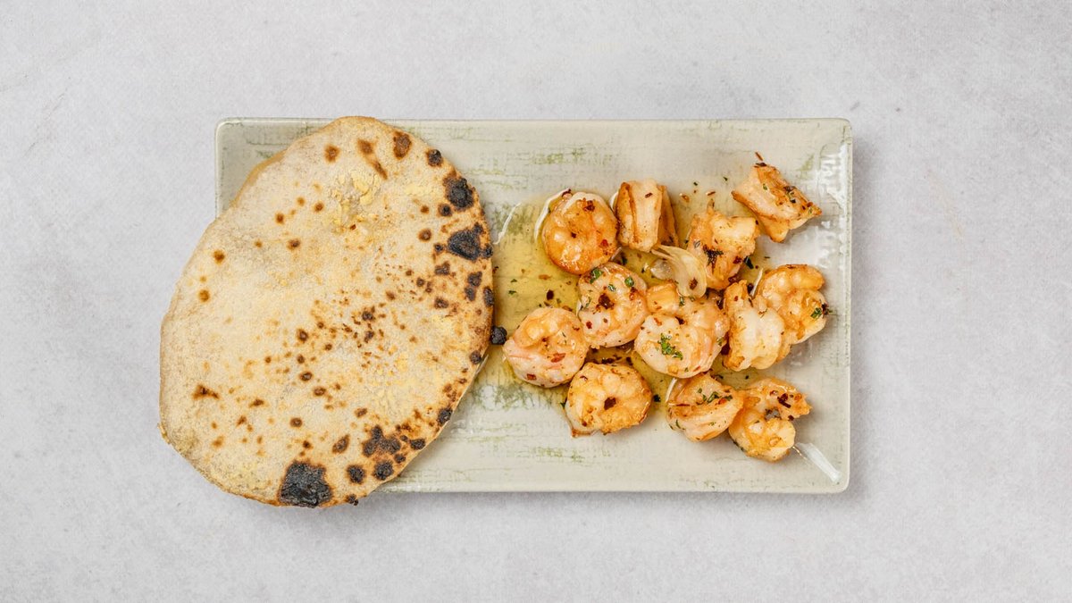 Kozice (150g), češnjak, chilli, peršin, flatbread