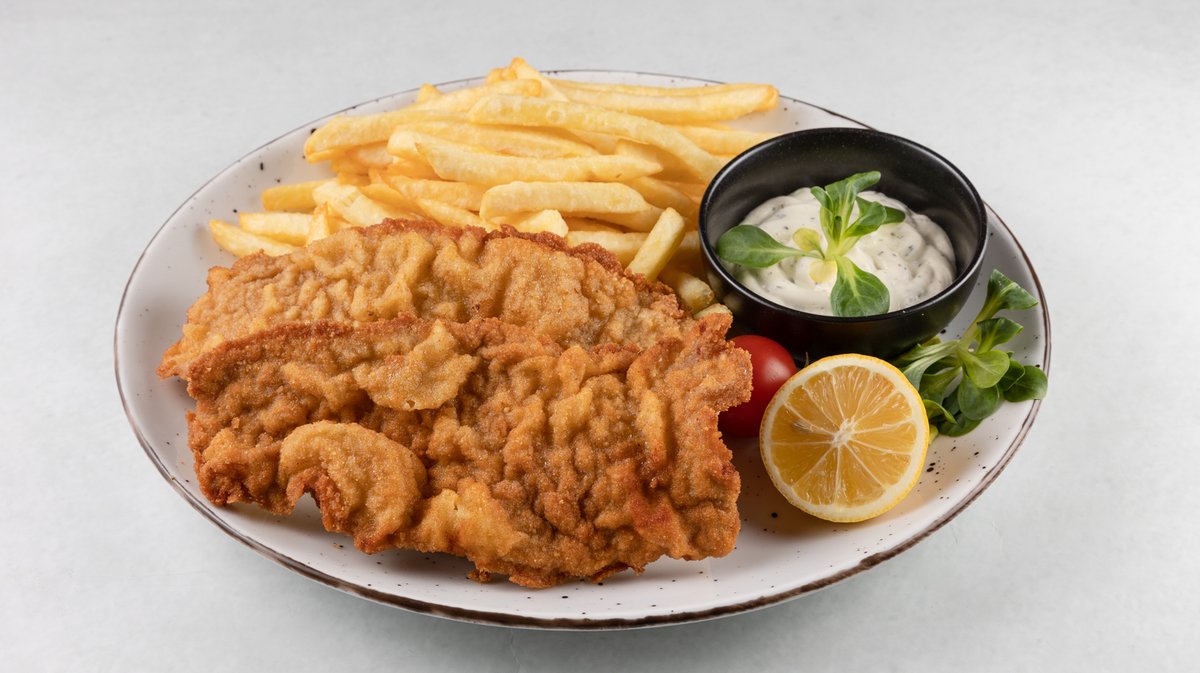 Pileći bečki odrezak, pommes frites, tartar, kruh *slika je simbolična