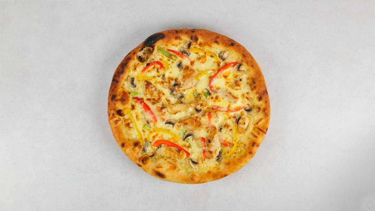 Rajčica, gouda, mozzarela, luk, šampinjoni, komadići pilećeg filea sa žara, kukuruz, paprika