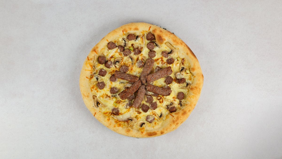 Gouda, mozzarela, luk, šampinjoni, komadići junećih ćevapa sa žara