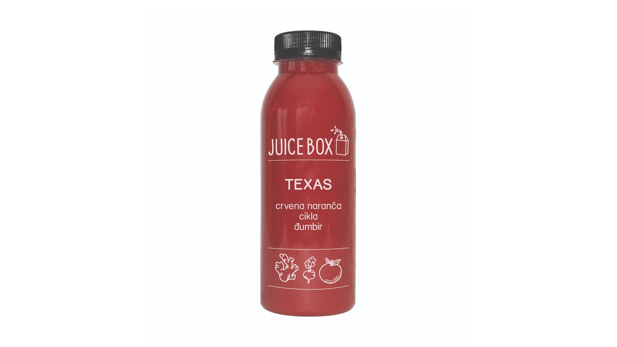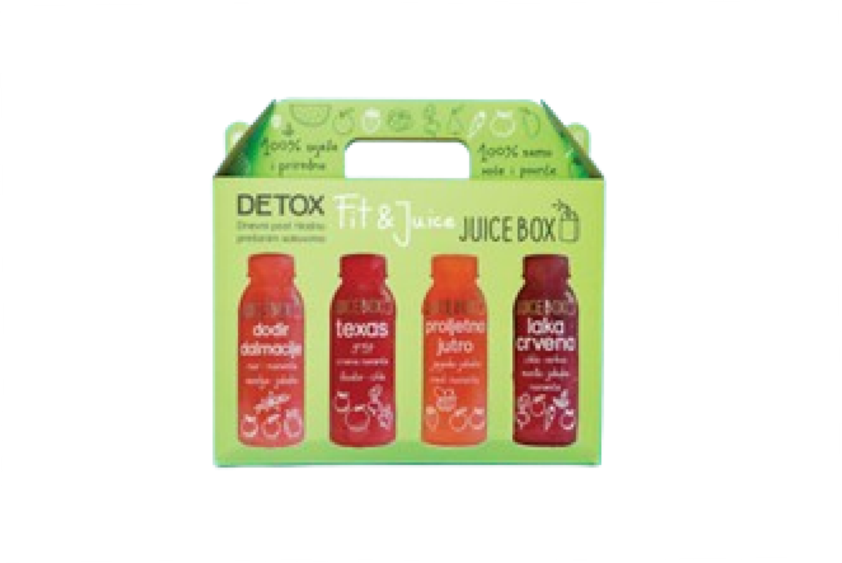 Detox Box Paket Crveni sadrži osam hladno prešanih sokova, svaki u bočici od 330 ml. Sokovi su napravljeni od svježeg voća i povrća, s naglaskom na crvene plodove bogate vitaminima, mineralima i antioksidansima. Bez dodane vode, šećera, konzervansa i aditiva, ovaj paket pruža prirodnu podršku organizmu, pomaže u čišćenju tijela i doprinosi osjećaju vitalnosti. Paket uključuje osam različitih sokova: Dodir Dalmacije, Texas, Proljetno jutro, Laka crvena, Sicilijana, Juice Box, Di je to i Crvena snaga. Sastojci svakog pojedinog soka mogu se pronaći zasebno na pakiranju svakog proizvoda.