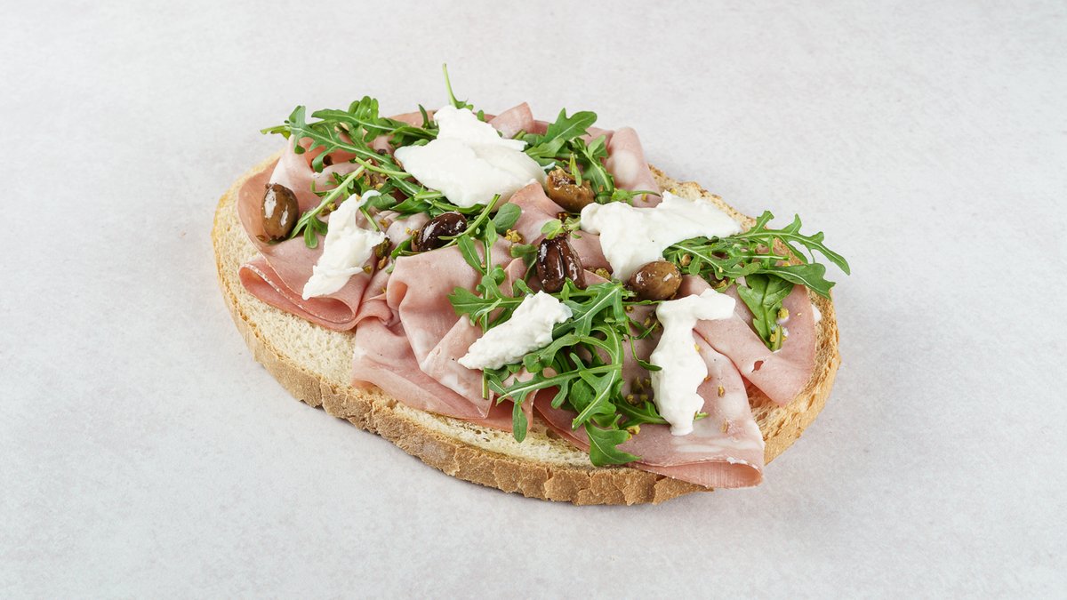 Bruschetta, mortadela, buratta, krema od pistacija, masline, rikola, maslinovo ulje