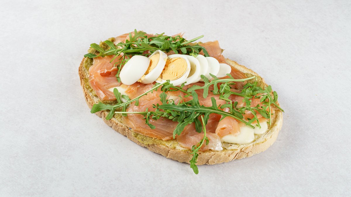Bruschetta, kuhano jaje, krema od šparoga, fiore di latte, dimljeni losos, maslinovo ulje, rukola