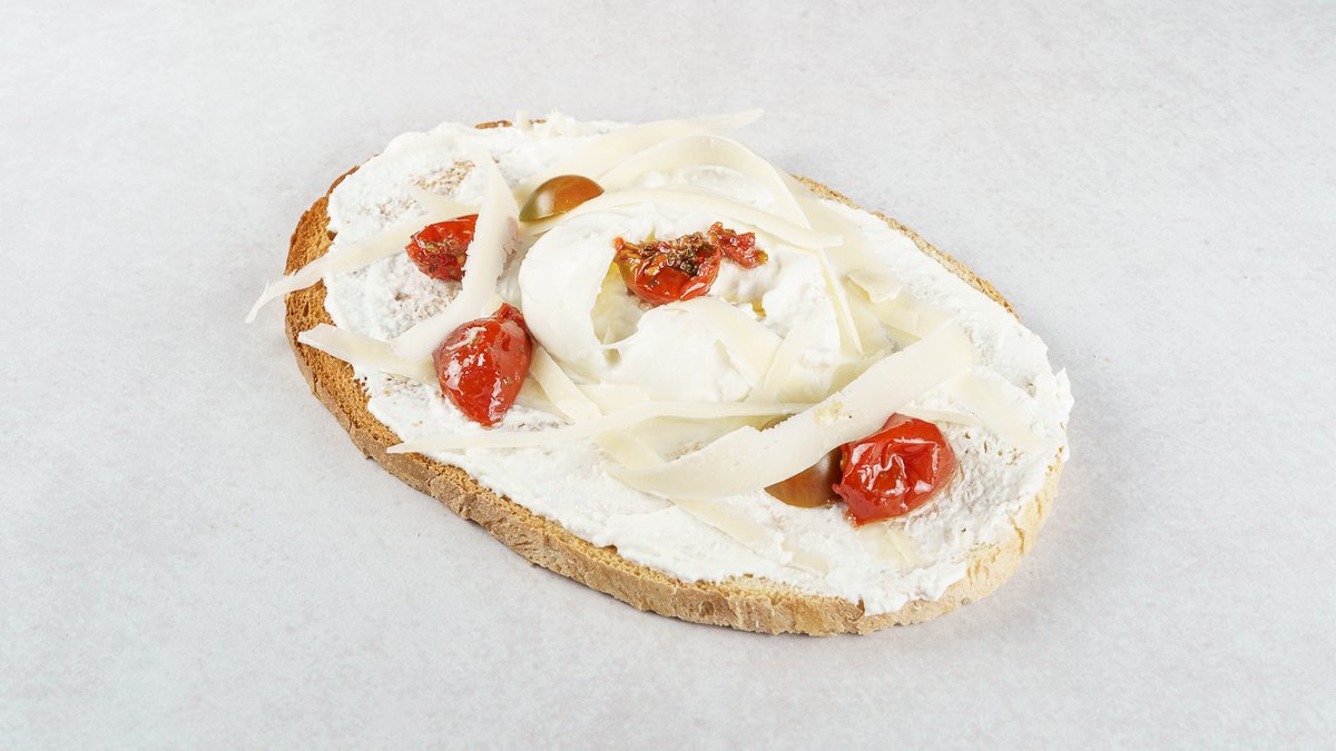 Bruschetta, burattina, grana padano, vrhovi brokole u ulju, ricotta, maslinovo ulje, rajčica semi secchi