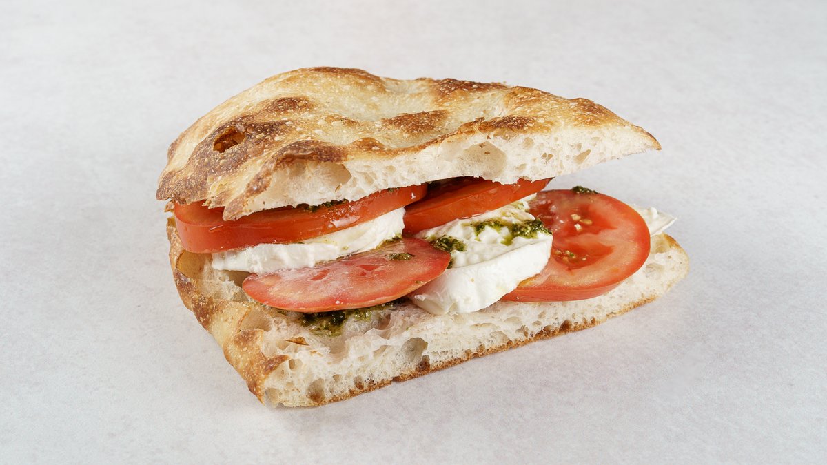 Focaccina by Boogie Bakery, mozzarella di buffalo D.O.P., rajčica, maslinovo ulje, rajčica semi secchi, bosiljak, pesto