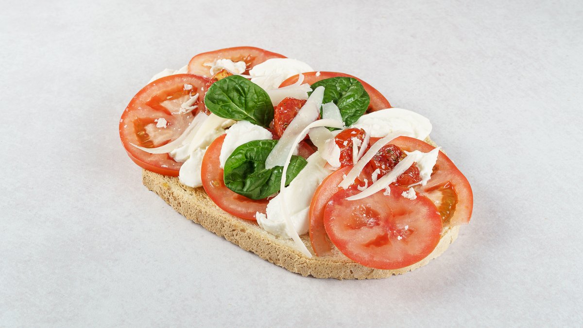 Bruschetta, rajčica, mozzarella di bufala DOP, grana padano, bosiljak, semi sechi rajčica, maslinovo ulje