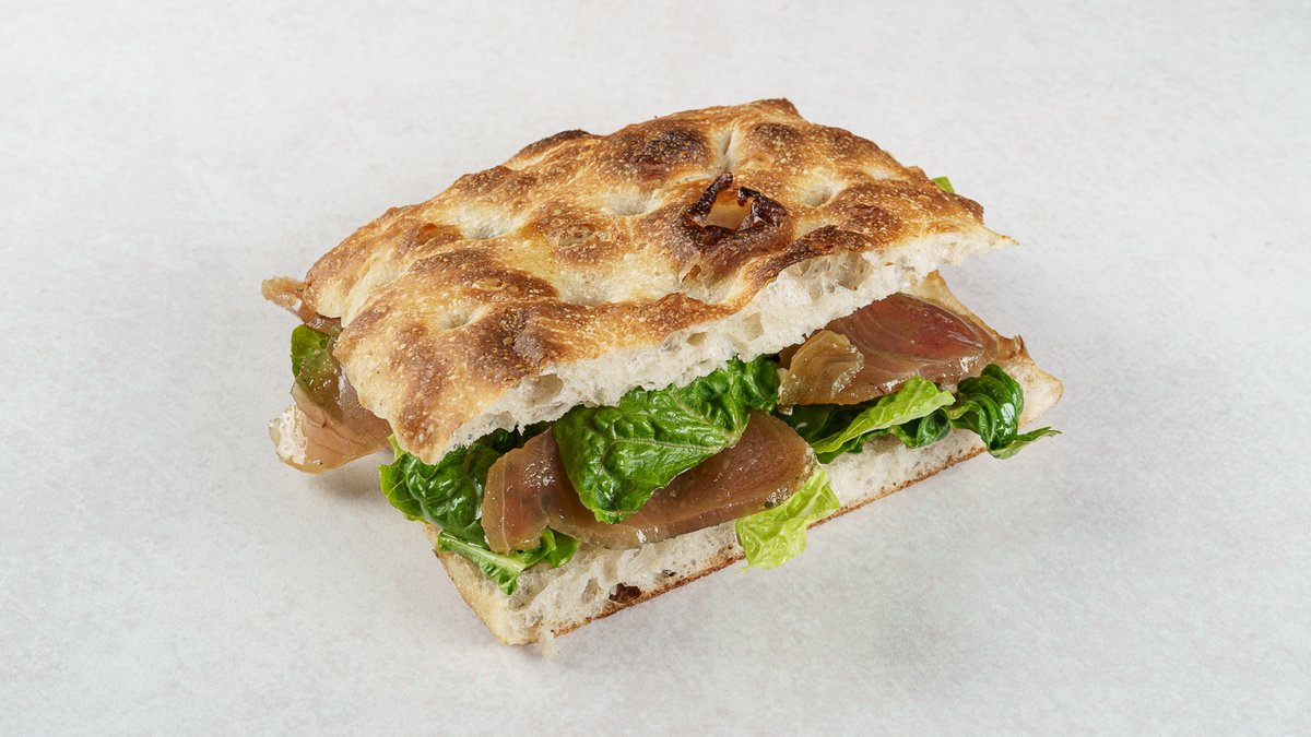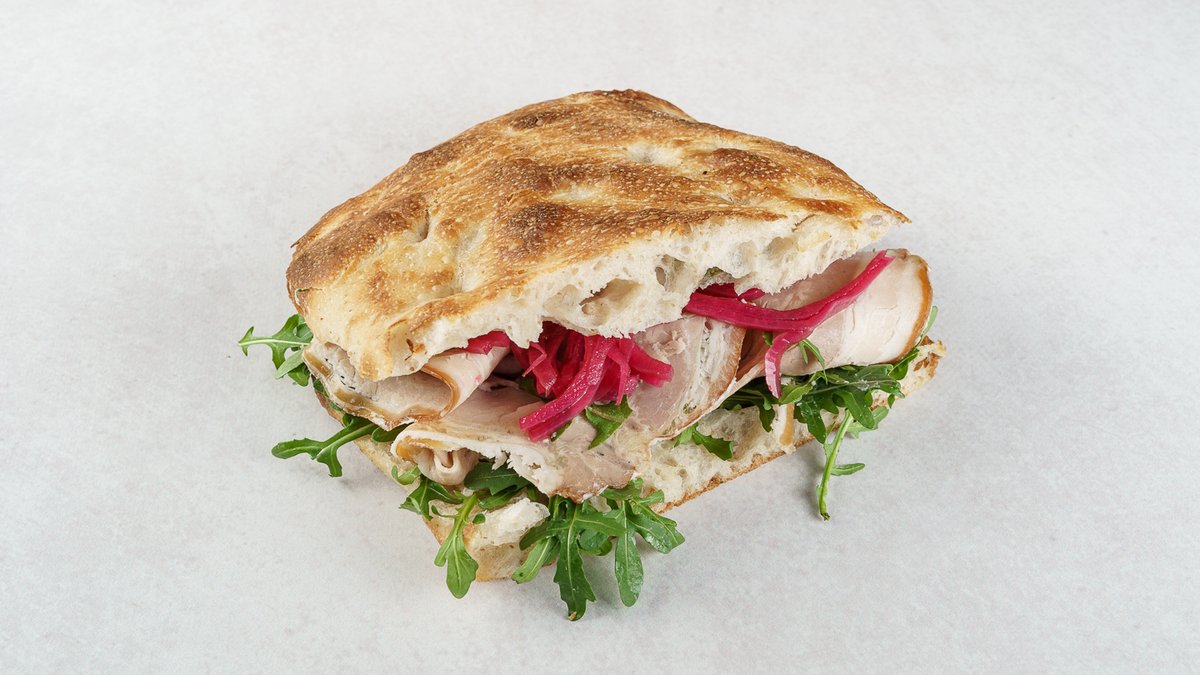 Focaccina by Boogie Bakery, rukola, porchetta, salsa verde, ukiseljeni ljubičasti luk