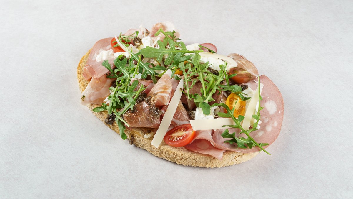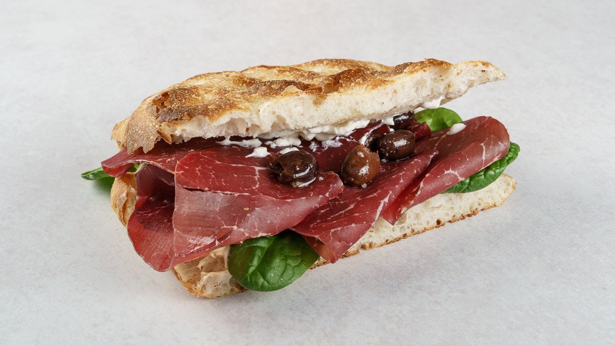 Focaccina by Boogie Bakery, ricotta, bresaola, krema od sicilijanske dimljene provole, baby špinat, masline