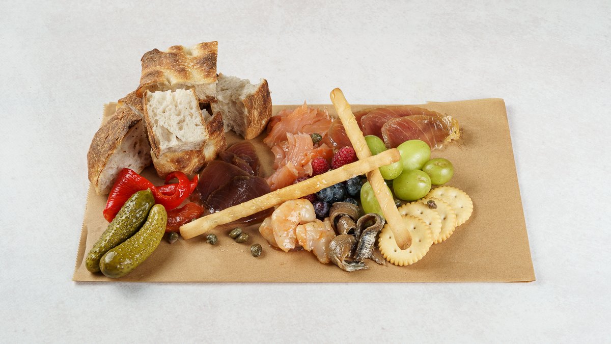 File slanih inćuna, dimljeni morski plodovi, krekeri, kiseli krastavci, kapari, pečena paprika, Focaccina by Boogie Bakery, svježe voće, lisnata salata