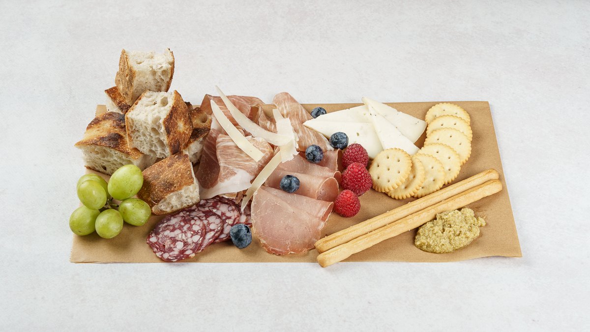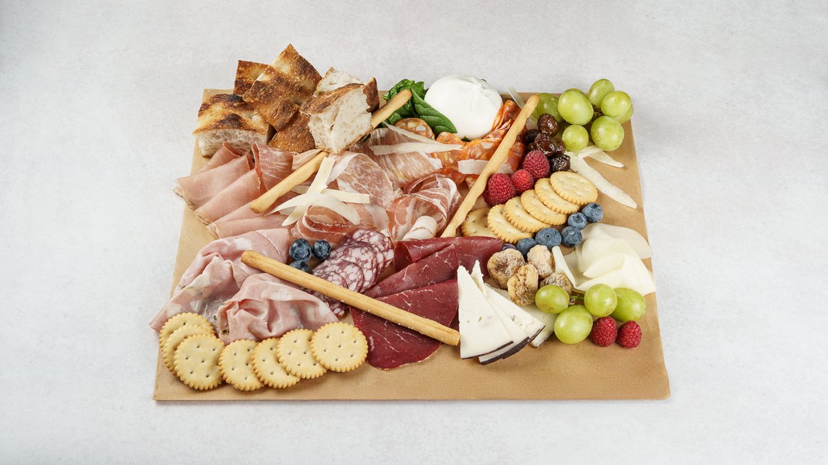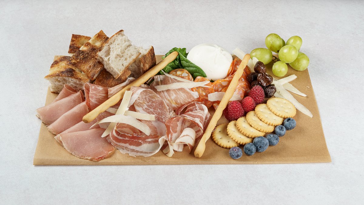 grana padano,mozzarella dimljena provola, kravlji sir u teranu, smokve, grisini, focaccina, Prosciutto di San Daniele ,Kobasica od divljači, krekeri, burattina, bresola, slanina, žlomprt, mortadela Bologna IGP, svježe voće