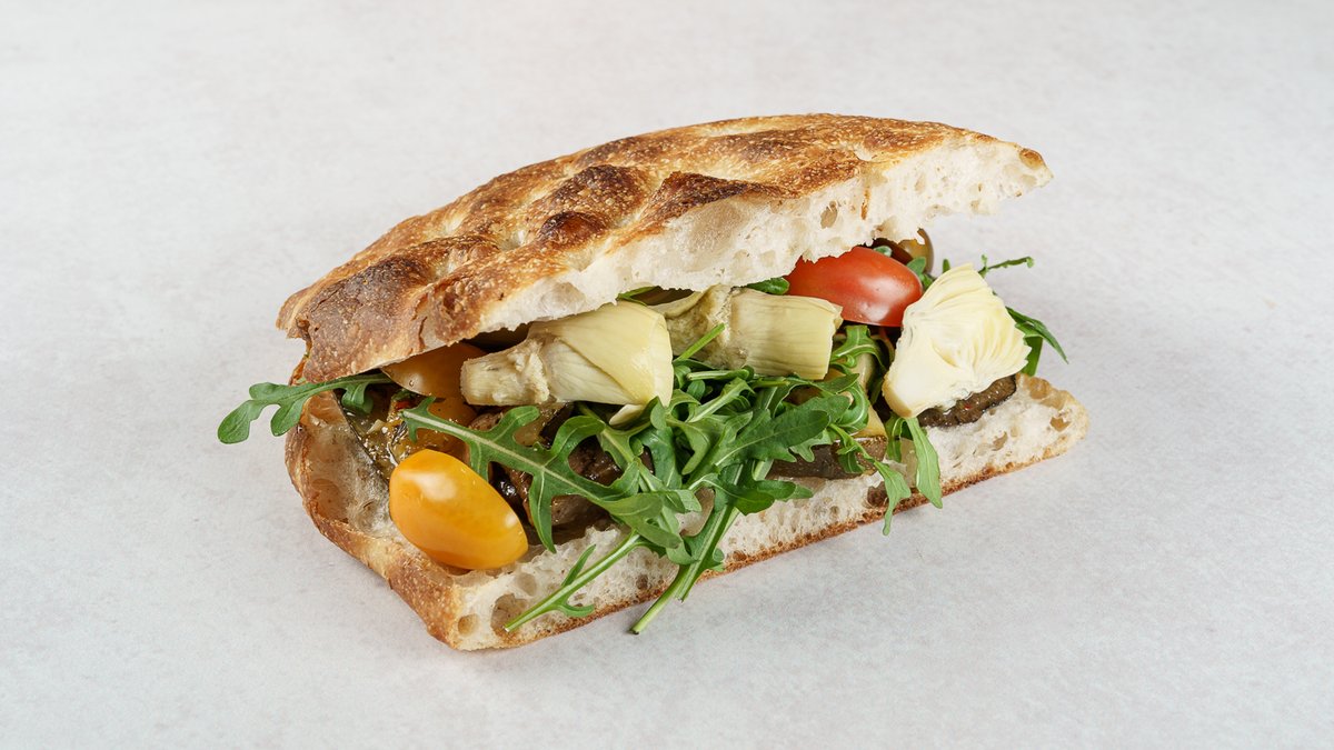 Focaccina by Boogie Bakery, pesto genovese, pečeno povrće, artičoke u salamuri, rajčica semi sechi