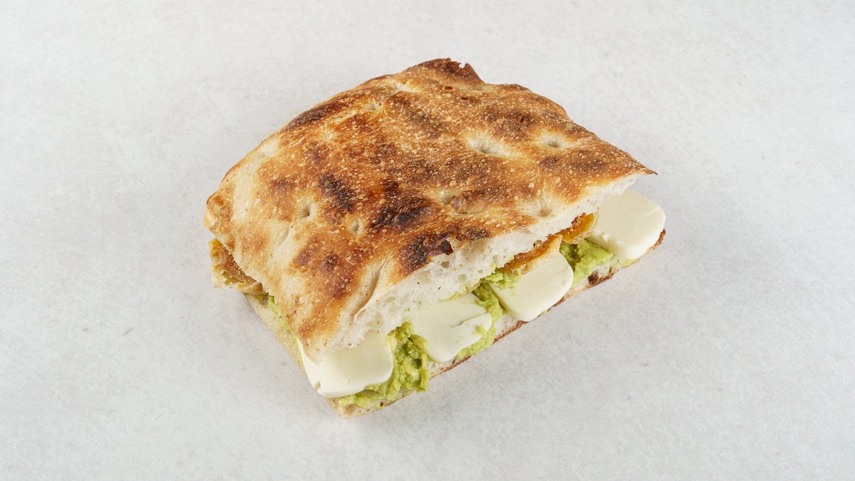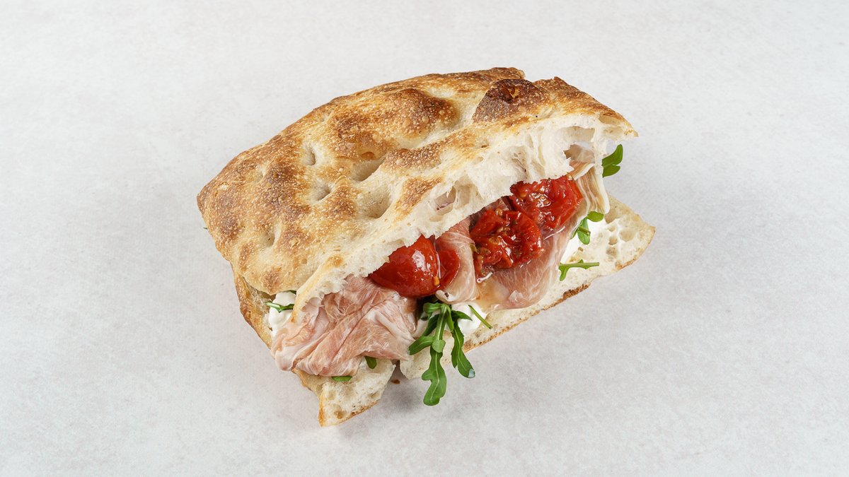 Focaccina by Boogie Bakery, rajčica semi secchi, praška šunka (Prosciutto cotto afumicato ala Praga), salata lisnata, mozzarella dimljena Provola
