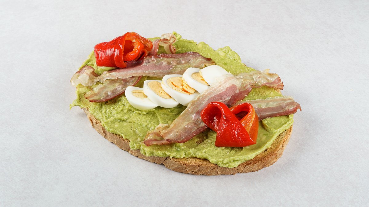 Bruschetta, kuhano jaje, maslinovo ulje, slanina, avokado, pečena paprika
