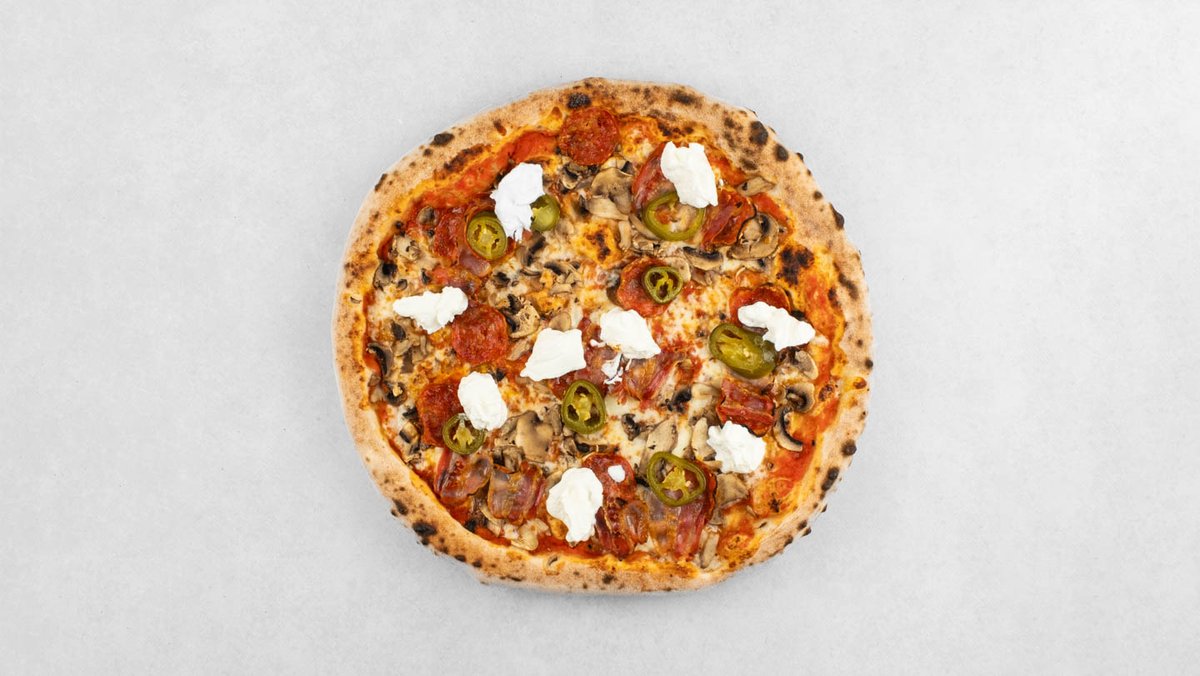 Pelat, mozzarella, edamer, šampinjoni, kulen, slanina, jalapeno papričice, vrhnje, origano