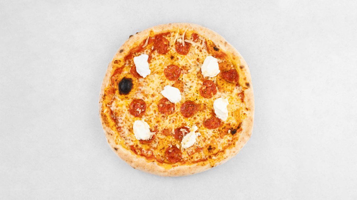Pelat, mozzarella, edamer, peperoni salama, grana padano, vrhnje, origano