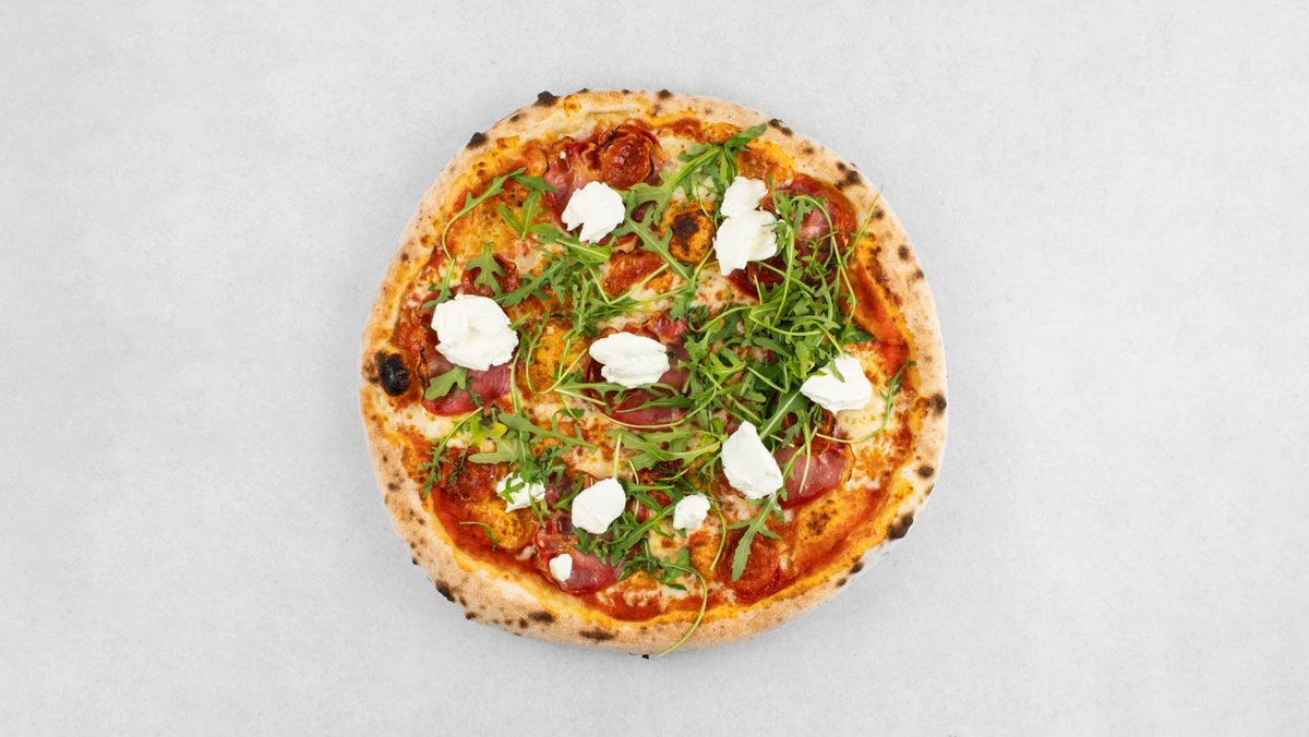 Pelat, mozzarella, edamer, vratina, kulen, cherry rajčica, rikola, vrhnje, origano