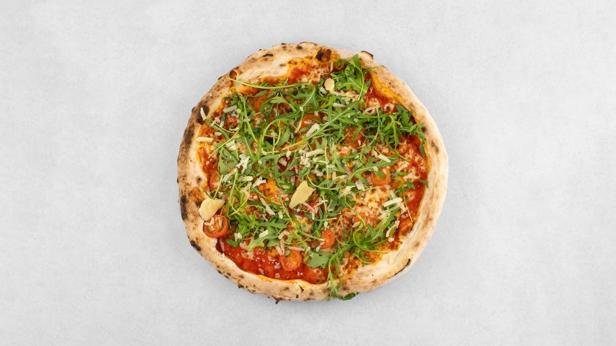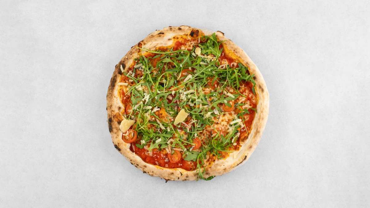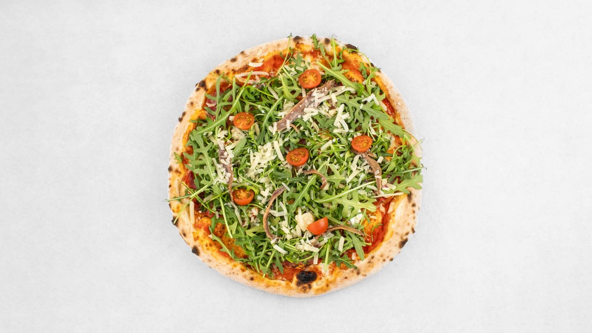 Pelat, mozzarella, edamer, inćuni, rikula, cherry rajčice, grana padano, origano. *slika je simbolična