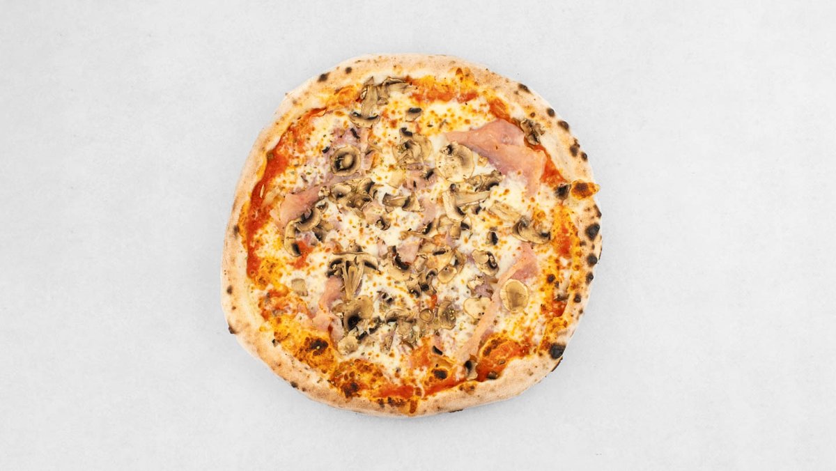 Pelat, mozzarella, šunka, šampinjoni, origano