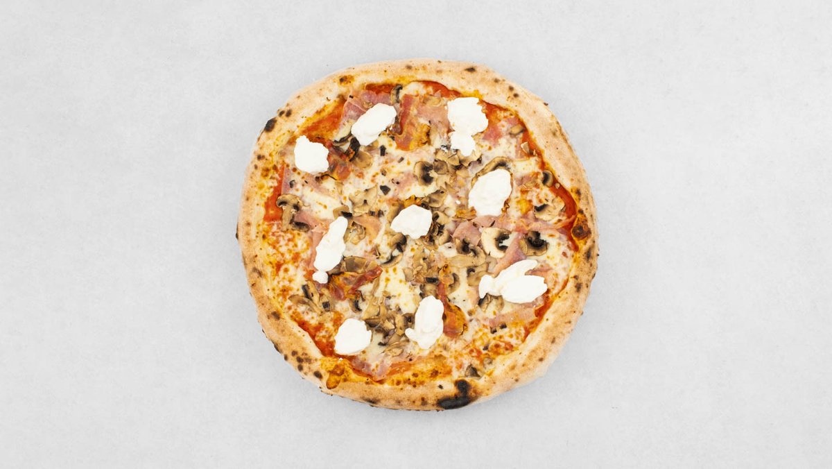 Pelat, mozzarella, edamer, šunka, panceta, šampinjoni, vrhnje, origano
