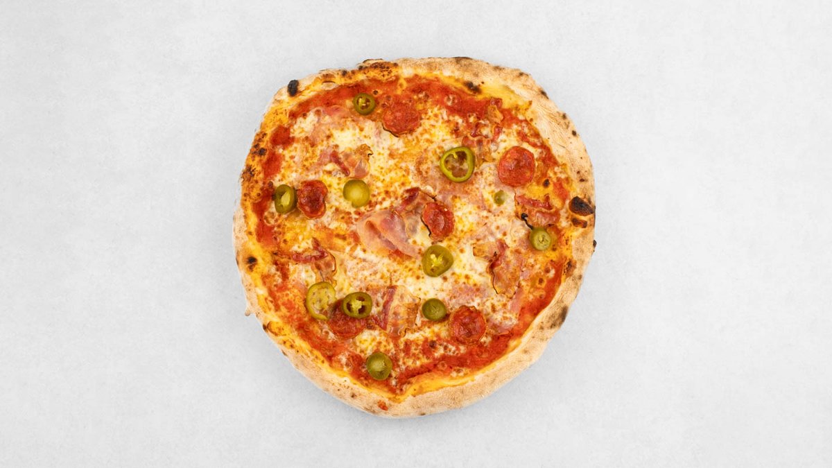 Pelat, mozzarella, edamer, šunka, panceta, zapečene jalapeno papričice, origano