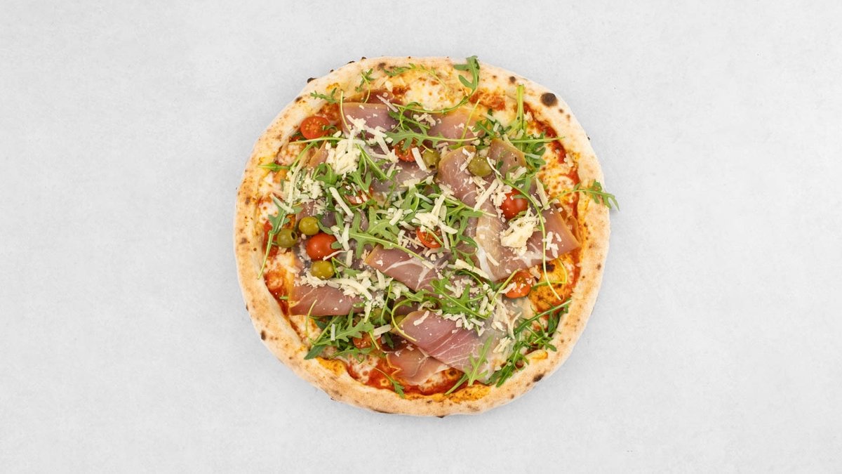 Pelat, mozzarella, edamer, pršut, rikula, datterini rajčice, masline, grana padano, origano