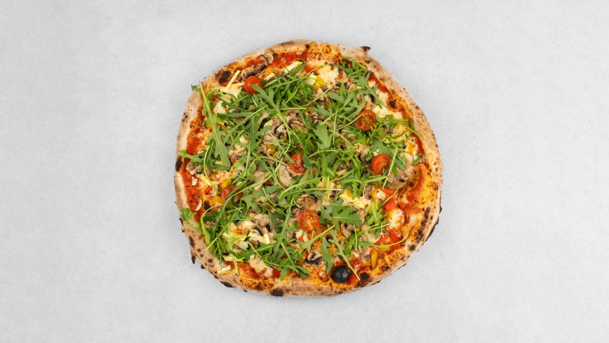 Pelat, mozzarella, edamer, šampinjoni, tikvica, paprika, rikula, origano