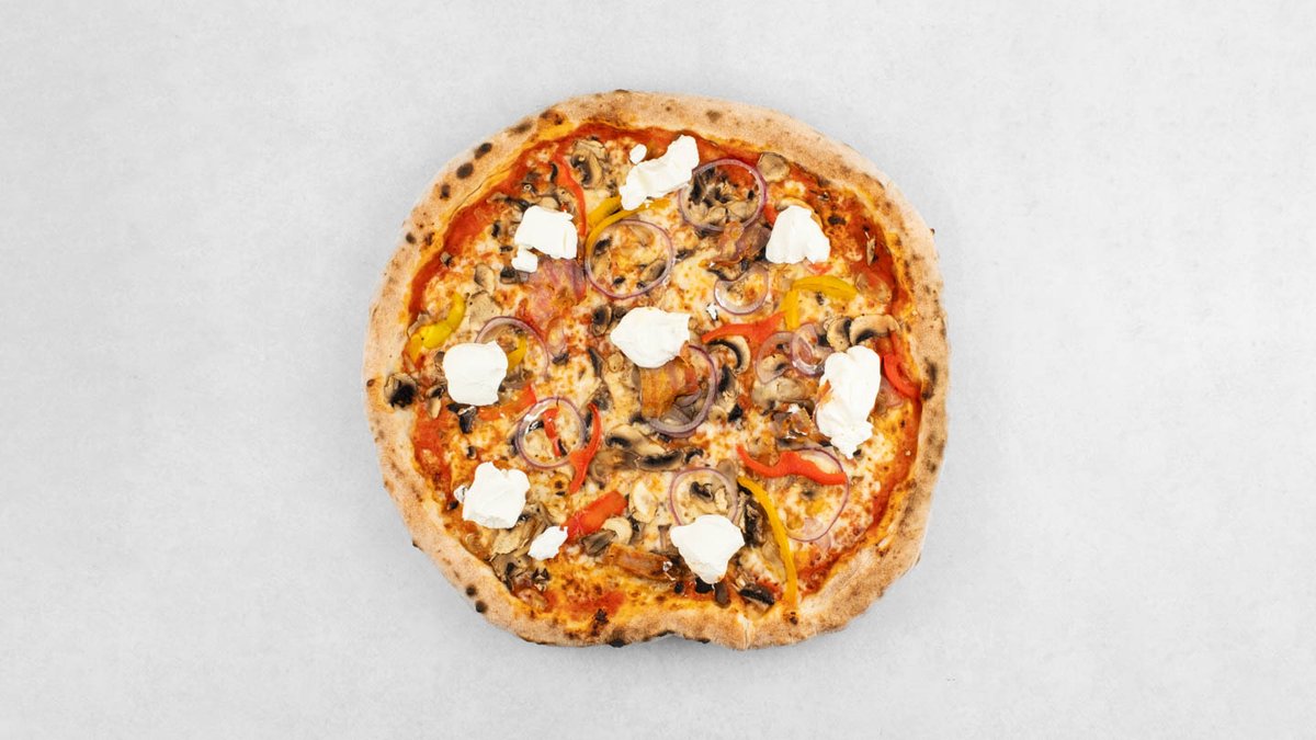Pelat, mozzarella, edamer, panceta, šampinjoni, crveni luk, paprika, vrhnje, origano *slika je simbolična