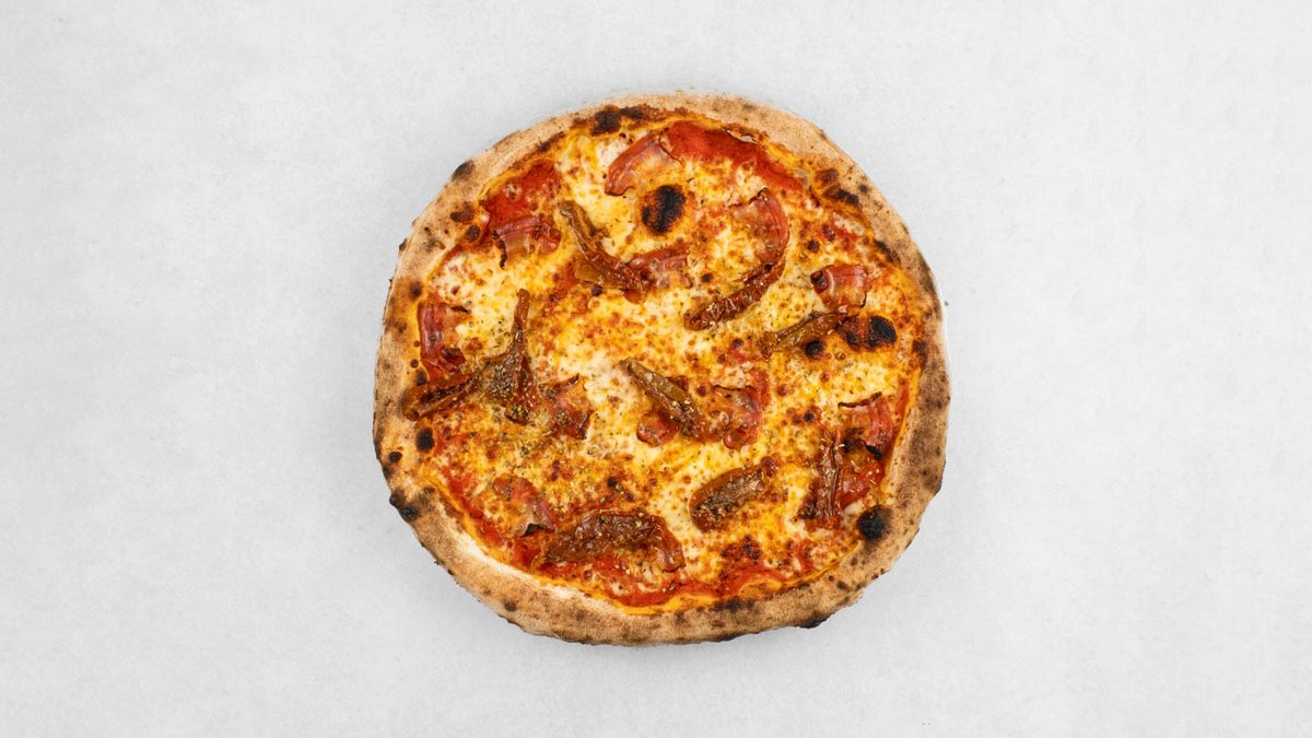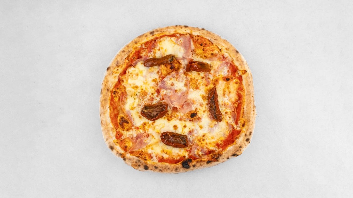 Pelat, mozzarella, edamer, šunka, taleggio, gorgonzola, sušene rajčice, origano *slika je simbolična